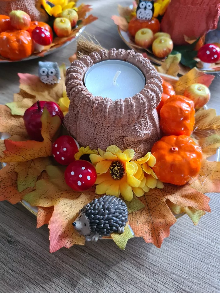 Dekorace, podzim, porcelánový hrníček se svícnem na jednu čajovou svíčku