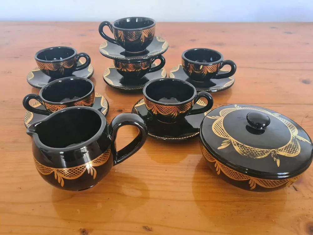Keramická sada, černá se zlatým zdobením, 6+6+mléčenka a konvička a cukřenka, cena za vše